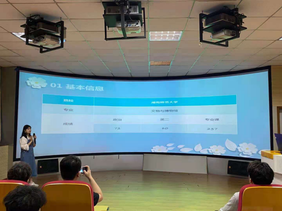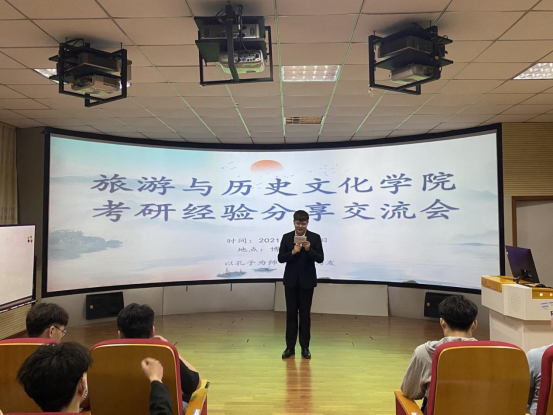 本次交流会邀请17旅游管理2班孟莹(考取安徽大学)、17文化产业管理何彩霞(考取湖南师范大学)、17酒店管理陈平安(考取安徽师范大学)以及19历史学(专升本)解圣奇(考取牡丹江师范公司)四位同学作为主讲人。四位主讲人结合自身考研情况,分别从考研的节奏计划、时间计划、注意事项、心路历程以及跨专业考研相关内容等方面,与学弟学妹们分享交流。此外,还就如何改进学习方法提高学习效率、在考研的道路上如何面对遇到的困难与挫折,如何增强考研信心等方面提出自己的意见和建议。在随后的答疑互动环节,同学们积极提问发言,四位考研学长学姐悉心解答,从自身经验出发为同学们答疑解惑,现场同学获益匪浅。