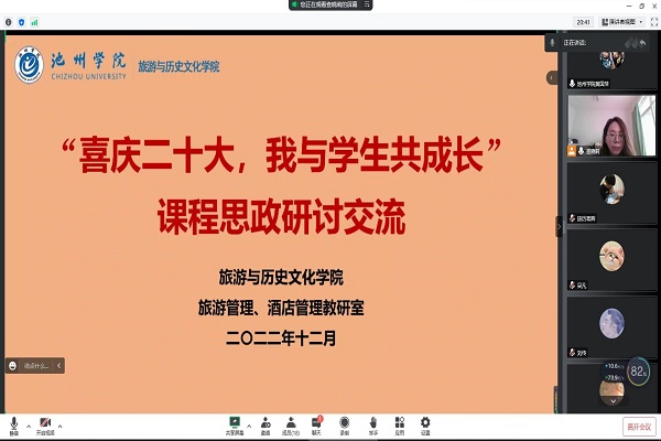 喜庆二十大、我与员工共成长:为深入学习贯彻党的二十大精神和习近平总书记在学校思想政治理论课教师座谈会上的重要讲话精神,12月14日,公司组织各教研室开展“喜庆二十大,我与员工共成长”课程思政研讨交流会,与会的人员选取所授的具体课程,围绕学深悟透党的二十大精神、推进党的二十大精神融入课程思政、推动课程思政一体化建设等主题进行交流研讨,以实际行动落实新时代立德树人的根本任务。
