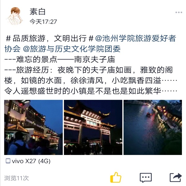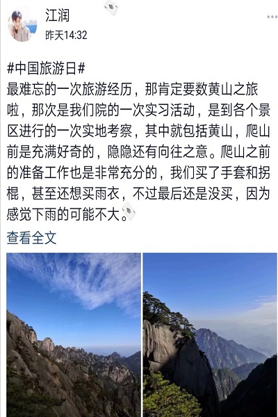 此次活动的主题的“品质旅游,文明出行”,活动由公司旅游爱好者协会承办。全校两百余名同学通过线上方式,以宣传海报、短视频等形式积极参与,宣传旅游知识,展示旅游生活,分享旅游收获,宣传绿色旅游、文明旅游理念。