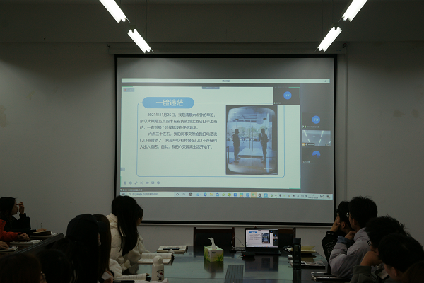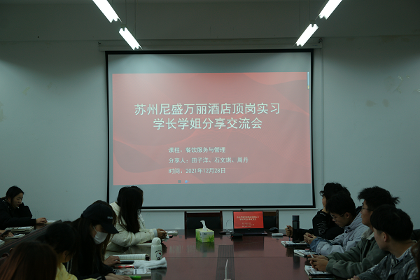 2021年12月28日,为推进课程思政建设,在最后一堂课结课前,授课老师蒋辉邀请了19酒店管理田子洋、石文琪、周丹三位同学采用线上视频的方式与大家分享了顶岗实习经历。